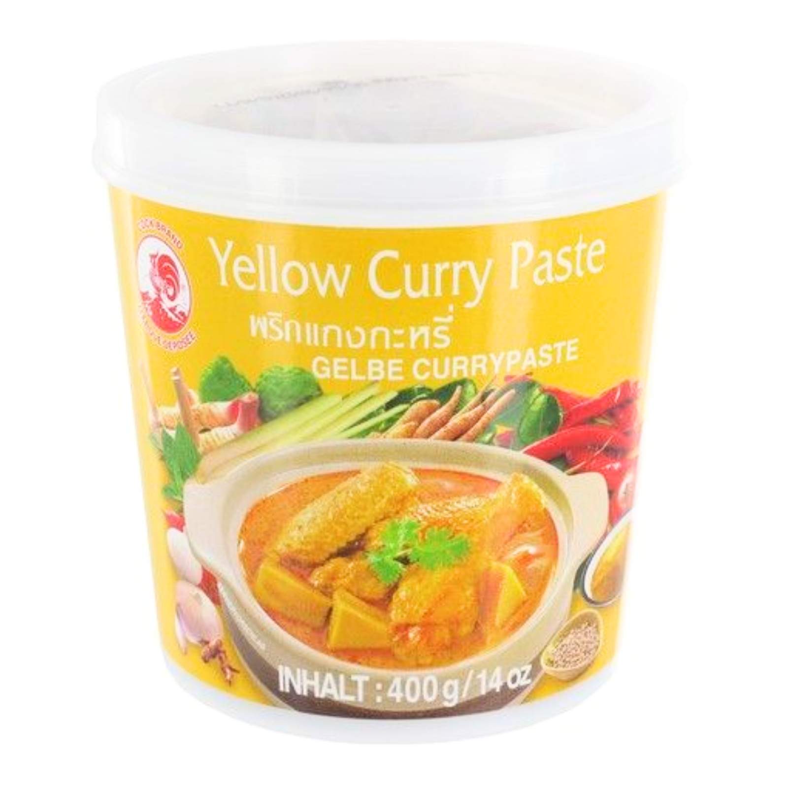 COCK Žltá kari pasta 400 g prináša do vašej kuchyne exotiku Thajska. Kombinácia chilli, citrónovej trávy, galangalu a kurkumy vytvára typickú žltú kari chuť – jemnejšiu než červené kari, no stále výraznú.