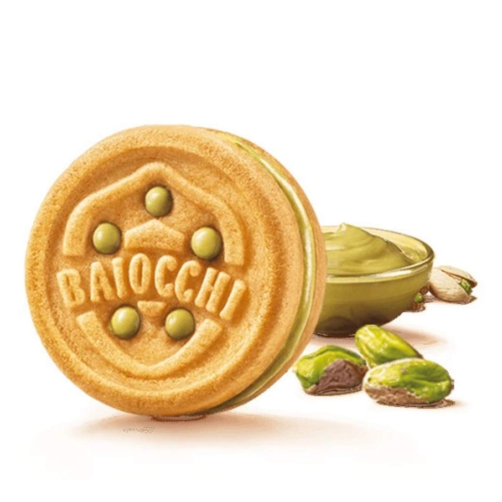 MULINO BIANCO Baiocchi pistáciové sušienky 240 g obsahujú 28 % pistáciovej náplne, ktorá dodáva výraznú arómu a jemnú sladkosť. Pistácie (7,6 % v náplni) vytvárajú prirodzene orieškový charakter, ktorý sa harmonicky spája s maslovou chuťou cesta.