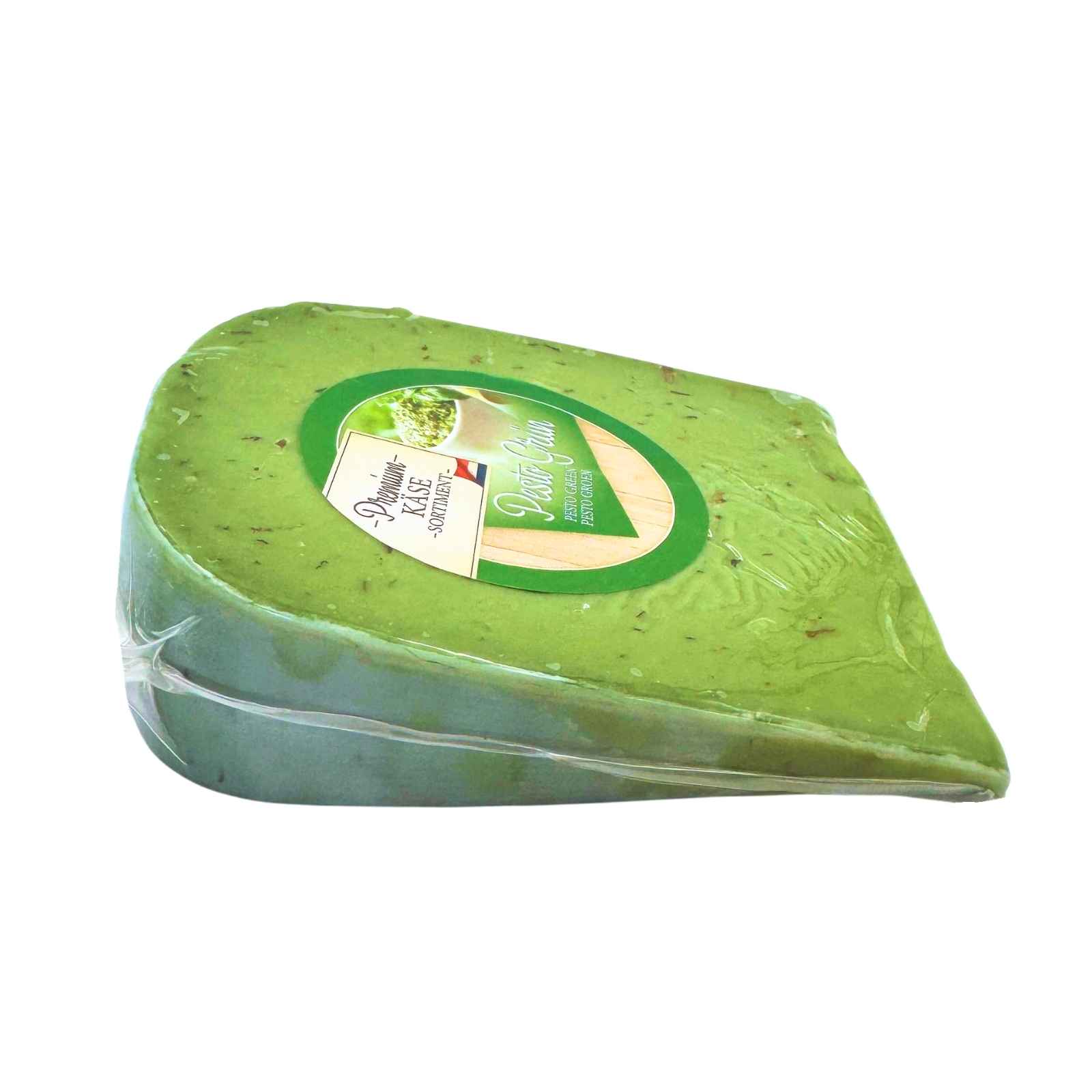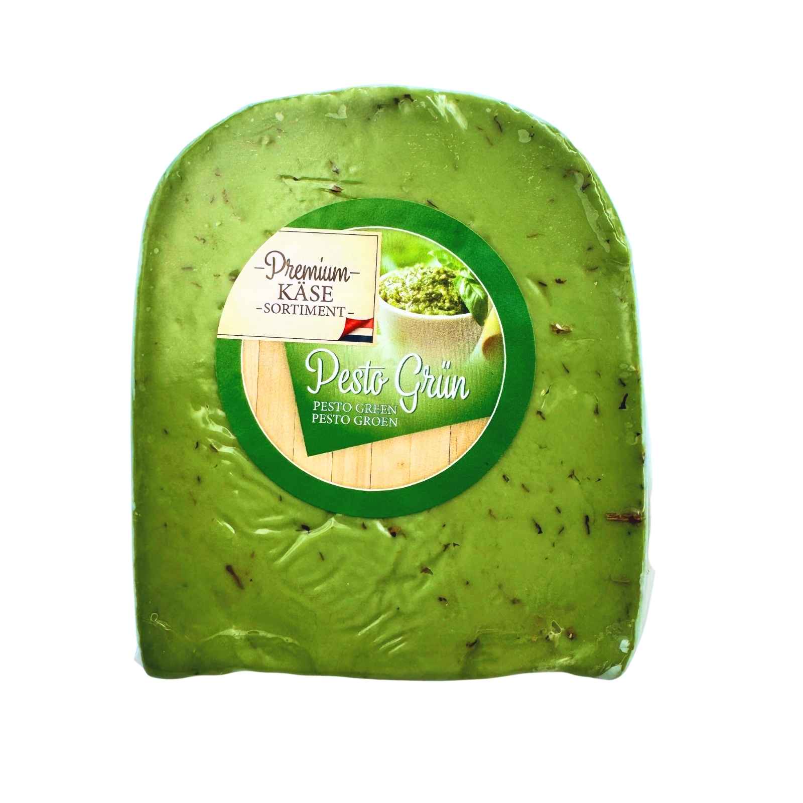 PREMIUM KÄSE SORTIMENT Kravská gouda so zeleným pestom 200 g pochádza z Holandska, krajiny známej svojou dlhoročnou syrovou tradíciou. Do jemnej goudy sa počas výroby pridáva zelené pesto s bazalkou a cesnakom, ktoré syru dodáva sviežu stredomorskú arómu.